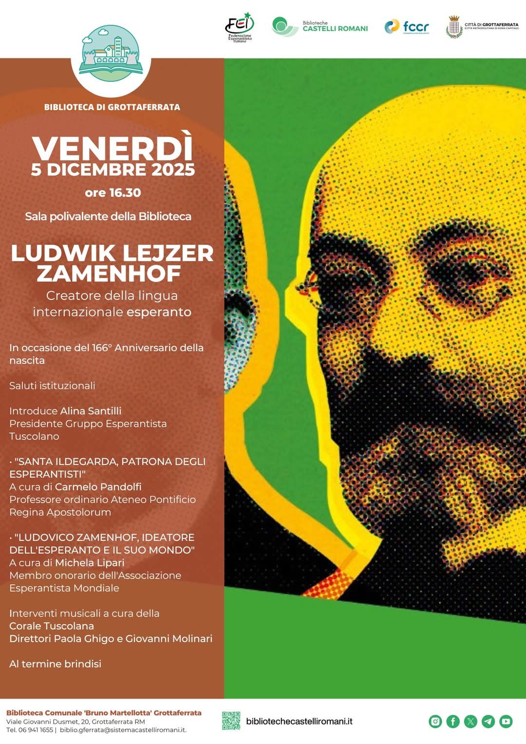 La Biblioteca Comunale “Bruno Martellotta” di Grottaferrata ospiterà venerdì 5 dicembre 2025, alle ore 16:30, un evento dedicato a Ludwik Lejzer Zamenhof, creatore della lingua internazionale esperanto, in occasione del 166° anniversario della sua nascita.