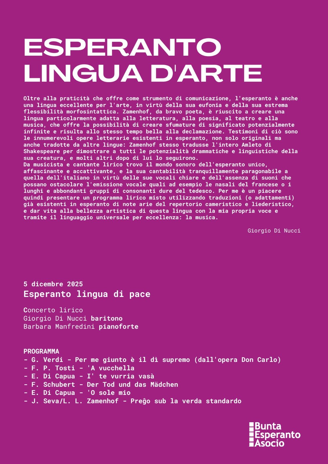 A seguire, gli ospiti potranno partecipare a un concerto lirico che arricchirà la serata con un programma musicale variegato. Il baritono Giorgio Di Nucci e la pianista Barbara Manfredini eseguiranno brani di G. Verdi, F. Schubert, E. Di Capua, e J. Seva/L. Zamenhof, quest’ultimo il fondatore della lingua internazionale Esperanto. L’esecuzione di queste opere in italiano, tedesco e Esperanto metterà in evidenza la bellezza della lingua di Zamenhof anche nel campo della musica.